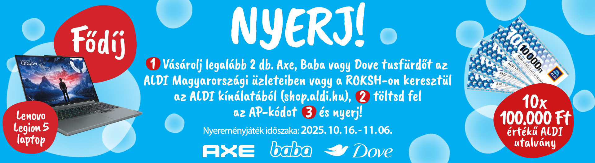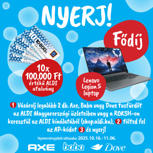 Vásárolj a ALDI Magyarország Élelmiszer Bt. magyarországi üzleteiben, vagy online rendelés útján a ROKSH-on keresztül az Aldi kínálatából legalább 2 db Axe, Baba* és/vagy Dove tusfürdő terméket, 2025. október 16. és 2025. november 6. között, és a Tiéd lehet a 10 db 100.000 Ft értékű Aldi vásárlási utalvány egyike, vagy a fődíj 1 db Lenovo laptop.