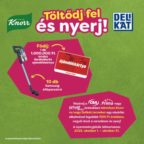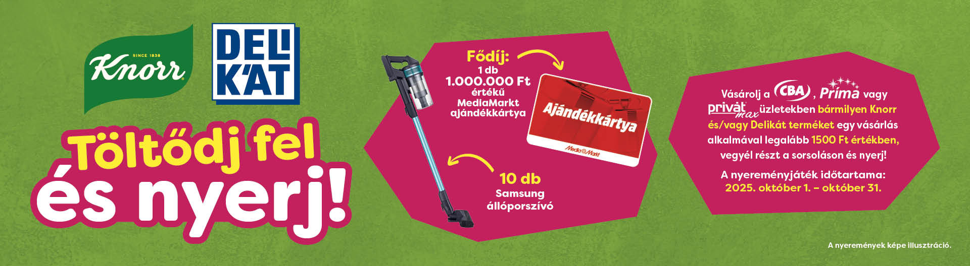 Vásárolj a CBA, Príma vagy Privát Max magyarországi üzleteiben egy vásárlás alkalmával minimum 1.500 forint értékben bármilyen Delikát és/vagy Knorr terméket 2025. október 1. és 2025. október 31. között, és a Tiéd lehet a 10 db Samsung állóporszívó egyike, vagy a fődíj egy 1.000.000 Ft értékű Media Markt ajándékkártya.