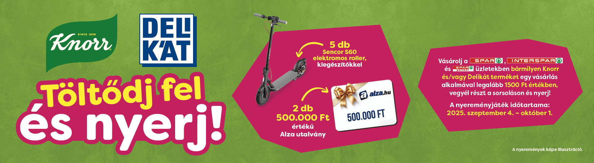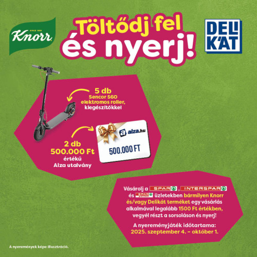 Vásárolj a Spar, Interspar vagy Spar pertnerek magyarországi üzleteiben egy vásárlás alkalmával minimum 1.500 forint értékben bármilyen Delikát és/vagy Knorr terméket 2025. szeptember 4. és 2025. október 1. között, és a Tiéd lehet az 5 db Sencor elektromos roller, vagy a 2 db 500.000 forint értékű Alza utalvány egyike.