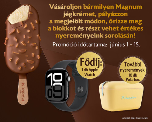 Vásároljon a CBA és CBA Príma magyarországi üzleteiben, vagy az áruház online webshopján keresztül 1 db bármilyen Magnum jégkrémet 2025. június 1. és 2025. június 15. között, és az Öné lehet a 10 db Polarbox sárga hűtődoboz egyike vagy a fődíj, egy Apple iWatch 10.