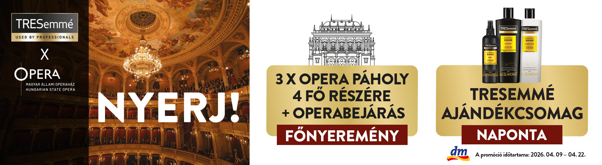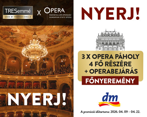 Vásárolj a dm magyarországi üzleteiben, vagy az áruház online webshopján keresztül, 1 db bármilyen TRESemmé terméket 2026. április 9. és 2026. április 22. között, és a tiéd lehet a 14 db TRESemmé ajándékcsomag egyike, vagy akár a fődíj, 3 db 4 személyes páholy jegy, Operabejárással egybekötve.