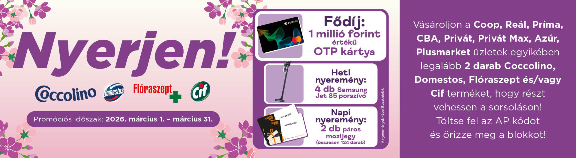 Vásároljon a Coop, Reál, CBA, Príma, Privát, Privát Max, Azúr, Plusmarket magyarországi üzleteiben egy vásárlás alkalmával legalább 2 darab bármilyen Coccolino, Domestos, Flóraszept és/vagy Cif terméket 2026. március 1. és 2026. március 31. között, és Öné lehet a napi 2 db Cinema City páros mozijegy, a heti 1 db Samsung Jet 85 premium álló porszívó egyike, vagy akár a fődíj az 1.000.000 Ft értékű OTP Prepaid kártya.